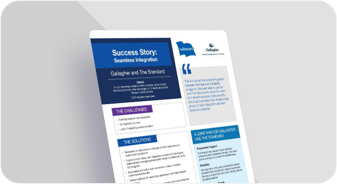 Success Story: Seamless Integration Gallagher and The Standard Client: This is a group that lacked integration A U.S. beverage company that produces, sells and dis- between their leave and disability tributes soda and other beverages in 13 states across the Western United States programs. We were able to partner 7,200 eligible employees with The Standard to assist the client with several program improvements THE CHALLENGES and build a process that will allow that group to have integration between • Existing program not integrated leave and disability. • No eligibility in place • Lack of reporting and automation THE SOLUTIONS A JOINT WIN FOR GALLAGHER • Dedicated on-site account manager for fast response and AND THE STANDARD customized assistance Responsive Support • Custom claim intake and integration process with third-party Our tenured local support team members administrator managing employer’s Family and Medical Leave answered calls and emails promptly. They went Act program above and beyond to meet the client’s needs. • Automated portability and conversion notice to remove administrative burden Flexibility • Online evidence of insurability submission with data feed for Working with a third-party administrator helped decisions streamline the client’s claim integration process. • Ongoing benefits administration subsidy worth approximately We also provided the client with a strong, flexible $130,000 annually financial incentive. • Removed suicide exclusion from child life insurance contract Good Service People • Increased life conversion period from 31 to 60 days One of our key strengths is service. We are Products offered: dedicated to exceptional, caring customer service. Life insurance · Short Term Disability insurance · Long Term We worked closely with the client throughout the Disability insurance · Absence Management Services process of consolidating benefits with us. Standard Insurance Company | standard.com Standard Insurance Company Internal Data as of June 30, 2018. The Standard is a marketing name for StanCorp Financial Group, Inc. and subsidiaries. Insurance products are off ered by Standard Insurance Company of Portland, Oregon in all states except New York. Product features and availability vary by state and are solely the responsibility of Standard Insurance Company. SI 00000 (0/00)