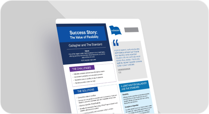 Success Story: The Value of Flexibility Gallagher and The Standard Client: This is a hospital client that was in One of the largest public health systems in the United States, need of better leave and accommodation offering specialty services that attract top talent and provide state-of-the-art care services. We were able to establish this 6,000 eligible employees with The Standard, and we had the ability to customize the leave notifications THE CHALLENGES to best fit with the hospital group. • Inflexible products and services with medical carrier • Inconsistent portability and conversion process • Needed to save on ancillary to pay for absence • Retiree population costs too high THE SOLUTIONS A JOINT WIN FOR GALLAGHER • Competitive rates on ancillary AND THE STANDARD • Savings on core products covered cost of outsourcing Family and Flexibility Medical Leave Act and Americans with Disabilities Act services Offering Voluntary benefits and streamlined benefits • Voluntary benefits offered flexibility administration provided the efficiency the client • Benefits Administration Technology Offset Program helped cover needed. We also provided the client with a strong, benefits administration system flexible financial incentive. • Automated portability and conversion notice to remove Compliance Expertise administrative burden Our client doesn’t have to go it alone when it comes • Increased guaranteed issue on Voluntary Life insurance to compliance. Outsourcing support from an expert Products offered: can help reduce the administrative burden and Short Term Disability insurance · Long Term Disability insurance · headaches from mismanaged documentation. Life insurance · Paid Family and Medical Leave services · Accident Competitive Savings insurance · Critical Illness insurance · Hospital Indemnity insurance Our client was able to save on benefits administration technology and core products so they could invest in the things that matter. The Benefits Administration Technology Offset Program allowed them to pick up Supplemental insurance. Competitive ancillary rates allowed them to outsource compliance services. Standard Insurance Company | standard.com Standard Insurance Company Internal Data as of June 30, 2018. The Standard is a marketing name for StanCorp Financial Group, Inc. and subsidiaries. Insurance products are off ered by Standard Insurance Company of Portland, Oregon in all states except New York. Product features and availability vary by state and are solely the responsibility of Standard Insurance Company. SI 00000 (0/00)