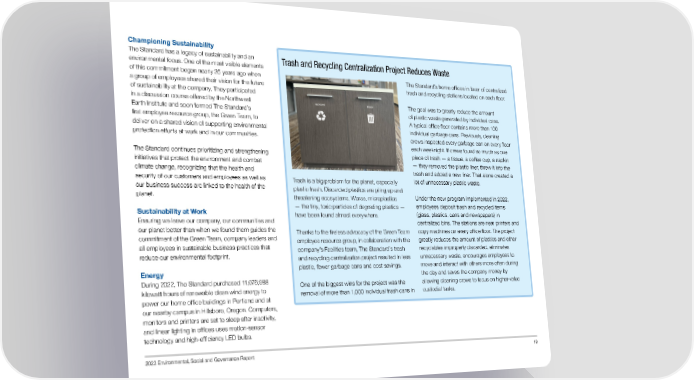 Championing Sustainability The Standard has a legacy of sustainability and an Trash and Recycling Centralization Project Reduces Waste environmental focus. One of the most visible elements of this commitment began nearly 25 years ago when The Standard’s home offces in favor of centralized a group of employees shared their vision for the future trash and recycling stations located on each foor. of sustainability at the company. They participated in a discussion course offered by the Northwest The goal was to greatly reduce the amount Earth Institute and soon formed The Standard’s of plastic waste generated by individual cans. frst employee resource group, the Green Team, to A typical offce foor contains more than 100 deliver on a shared vision of supporting environmental individual garbage cans. Previously, cleaning protection efforts at work and in our communities. crews inspected every garbage can on every foor each weeknight. If crews found so much as one The Standard continues prioritizing and strengthening piece of trash — a tissue, a coffee cup, a napkin initiatives that protect the environment and combat — they removed the plastic liner, threw it into the climate change, recognizing that the health and trash and added a new liner. That alone created a security of our customers and employees as well as lot of unnecessary plastic waste. Trash is a big problem for the planet, especially our business success are linked to the health of the plastic trash. Discarded plastics are piling up and planet. Under the new program implemented in 2022, threatening ecosystems. Worse, microplastics employees deposit trash and recycled items Sustainability at Work — the tiny, toxic particles of degrading plastics — have been found almost everywhere. (glass, plastics, cans and newspapers) in Ensuring we leave our company, our communities and centralized bins. The stations are near printers and our planet better than when we found them guides the copy machines on every offce foor. The project Thanks to the tireless advocacy of the Green Team commitment of the Green Team, company leaders and greatly reduces the amount of plastics and other employee resource group, in collaboration with the all employees in sustainable business practices that recyclables improperly discarded, eliminates company’s Facilities team, The Standard’s trash reduce our environmental footprint. unnecessary waste, encourages employees to and recycling centralization project resulted in less move and interact with others more often during Energy plastic, fewer garbage cans and cost savings. the day and saves the company money by During 2022, The Standard purchased 11,076,988 allowing cleaning crews to focus on higher-value kilowatt hours of renewable clean wind energy to One of the biggest wins for the project was the custodial tasks. power our home offce buildings in Portland and at removal of more than 1,000 individual trash cans in our nearby campus in Hillsboro, Oregon. Computers, monitors and printers are set to sleep after inactivity, and linear lighting in offces uses motion-sensor technology and high-effciency LED bulbs. 2022 Environmental, Social and Governance Report 19
