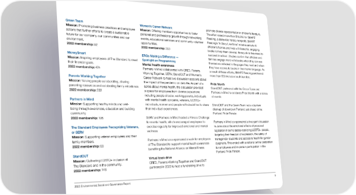 Green Team Women’s Career Network promote diverse representation in children’s literature. Mission: Promoting business practices and employee Mission: Offering members opportunities to foster The effort raised more than $16,000 for SMART actions that further efforts to create a sustainable personal and professional growth through networking Reading, a statewide literacy nonproft. SMART future for our company, our communities and our events, educational seminars and community volunteer Reading’s “A Story Like Mine” initiative aims to fll environment. opportunities. children’s homes and lives with beautiful, engaging 2022 membership: 92 2022 membership: 353 books to help them develop literacy skills they need to succeed in school. Studies confrm that children and Money$mart ERGs Making a Difference — families engage more with books when they can see Mission: Inspiring employees of The Standard to meet Spotlight on Programming themselves refected in the pages they read and when their fnancial goals. Mental health awareness they have access to books in their home language. As 2022 membership: 424 Partners in Mind collaborated with CRED, Parents a result of these efforts, SMART Reading purchased Working Together, SERV, StandOUT and Women’s more than 650 inclusive book bundles. Parents Working Together Career Network to host two discussion sessions about Mission: Valuing people collaborating, sharing the impact of the pandemic on daily life. As part of a Pride Month parenting resources and celebrating family milestones. series about mental health, the discussion provided StandOUT partnered with the Green Team and 2022 membership: 232 a space for employees from diverse populations Partners in Mind to celebrate Pride Month with a series including people of color, working parents, individuals of events. Partners in Mind with mental health concerns, veterans, LGBTQ+ Mission: Supporting healthy minds and well- individuals, women and people with disabilities to share StandOUT and the Green Team led a volunteer being through awareness, education and building their individual experiences. cleanup of downtown Portland just ahead of the community. Portland Pride Parade. 2022 membership: 105 SERV and Partners in Mind hosted a Fitness Challenge for mental health, which encouraged employees to Partners in Mind co-sponsored a two-part discussion The Standard Employees Recognizing Veterans, exercise regularly for improved emotional and mental in June about the emotional effects of proposed or SERV wellness. legislation in some states restricting LGBTQ+ people, Mission: Supporting veteran employees and their targeting their freedom of expression, the safety of family members. Partners in Mind also sponsored a walk for employees transgender students and access to health for gender 2022 membership: 60 of The Standard to support mental health awareness dysphoria. This ended with a national online celebration benefting the National Alliance on Mental Illness. for employees and in-person participation in the StandOUT Portland Pride Parade. Mission: Cultivating LGBTQ+ inclusion at Virtual book drive The Standard and in the community. CRED, Parents Working Together and StandOUT 2022 membership: 146 partnered in 2022 to host a fundraising drive to 2022 Environmental, Social and Governance Report 9