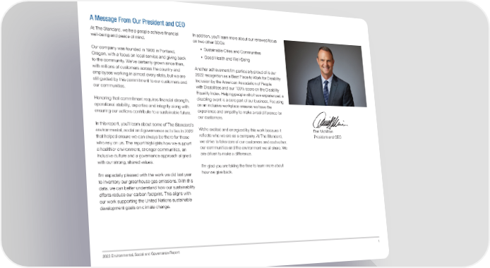 A Message From Our President and CEO At The Standard, we help people achieve fnancial In addition, you’ll learn more about our renewed focus well-being and peace of mind. on two other SDGs: • Sustainable Cities and Communities Our company was founded in 1906 in Portland, • Oregon, with a focus on local service and giving back Good Health and Well-Being to the community. We’ve certainly grown since then, with millions of customers across the country and Another achievement I’m particularly proud of is our employees working in almost every state, but we are 2022 recognition as a Best Place to Work for Disability still guided by this commitment to our customers and Inclusion by the American Association of People our communities. with Disabilities and our 100% score on the Disability Equality Index. Helping people who have experienced a Honoring that commitment requires fnancial strength, disabling event is a core part of our business. Focusing operational stability, expertise and integrity along with on an inclusive workplace ensures we have the ensuring our actions contribute to a sustainable future. experience and empathy to make a real difference for our customers. In this report, you’ll learn about some of The Standard’s environmental, social and governance activities in 2022 We’re excited and energized by this work because it Dan McMillan refects who we are as a company. At The Standard, that helped ensure we can always be there for those President and CEO we strive to take care of our customers and each other, who rely on us. The report highlights how we support our communities and the environment we all share. We a healthier environment, stronger communities, an inclusive culture and a governance approach aligned are driven to make a difference. with our strong, shared values. I’m glad you are taking the time to learn more about I’m especially pleased with the work we did last year how we give back. to inventory our greenhouse gas emissions. With this data, we can better understand how our sustainability efforts reduce our carbon footprint. This aligns with our work supporting the United Nations sustainable development goals on climate change. 2022 Environmental, Social and Governance Report 1