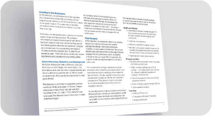 The Standard offers a competitive benefts package Investing in Our Employees Our company relies on a strong learning culture, to support employee wellness at work as well as away At The Standard, our employees focus their expertise with every employee given access to formal and and compassion on personally connecting with and informal educational offerings. We encourage and from the job. Benefts and perks include: supporting our customers, which translates into a culture offer support for everyone to bring curiosity and of caring and respect. It’s a genuinely collaborative creativity to all aspects of their work — focusing on Health and Wellness • Comprehensive medical coverage through PPO atmosphere where employees are inspired to do their continuous improvement of our products and services, and consumer-directed health plans (including best every day. work processes and the ways we engage with our an annual employer health savings account communities. Sustaining and strengthening this culture is an important contribution) aspect of our continued success. The company Total Rewards • Dental and vision insurance At The Standard, our people are critical to our success. encourages and supports employees in their efforts to • Enhanced mental health support services We are committed to providing a total rewards build and enhance their skills, develop fulflling careers package that attracts, retains and continuously • and deliver positive results for our customers, company Short-term and long-term disability insurance, life motivates our employees to be their best. Recognizing and communities. Our average employee tenure is insurance and supplemental insurance products that the right work environment to encourage employee 10 years across the company and 16 years for our (Accident, Critical Illness and Hospital Indemnity) engagement and performance varies, we adopted leadership team. That’s well above industry and national • Expert second medical opinion service a fexible workplace model. With this approach, the benchmarks and a testament to our strong culture. majority of roles are eligible for either fully remote or Financial and More • Annual incentive bonus plans linked to company Talent Attraction, Retention and Development hybrid work. We believe that people make a difference, especially and individual performance Our compensation strategy is performance-driven, • 401(k) matching contribution up to 5% of when they act with integrity and determination. This providing market-competitive pay plus incentives for all earnings — no vesting required and additional belief allows us to work as a team to put people frst and employees and above-market pay and incentives for 4% company contribution regardless of deliver outstanding customer service. We’ve created high performers. We also regularly conduct pay equity employee contribution level an environment where people are empowered to make assessments to ensure we offer fair and competitive good choices. • Home offce equipment setup and additional compensation. This approach inspires our people equipment allowance to reach their potential and ultimately drives our The Standard is committed to supporting a remote • Financial wellness support through LifeCents workforce. While we’re based in Portland, Oregon, company’s success. • Tuition assistance program employees in many of our roles can work from anywhere in the U.S. In fact, 77.5% of the 533 new As a leading provider of group insurance solutions and Time Away fnancial services, we help our clients establish beneft employees The Standard hired in 2022 work in states • Generous PTO accrual options that attract and retain good employees, and other than Oregon. • Company-paid holidays (11 annually) we’ve taken our own advice in selecting benefts for our • Annual wellness days employees. 2022 Environmental, Social and Governance Report 4