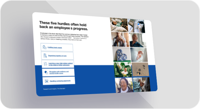 These 昀椀ve hurdles often hold back an employee’s progress. Employees in the study described 昀椀ve common obstacles that made it harder to recover or return to work as they lived through these moments. The research also showed employees shared a dominant belief — that when it came to a serious illness, injury or disabling condition, they were on their own. Ful昀椀lling basic needs Organizing logistics of care Learning a new, high-stakes subject in the midst of other unknowns Struggling with wellness and mental health needs Handling confusing paperwork Research and Insights | The Standard
